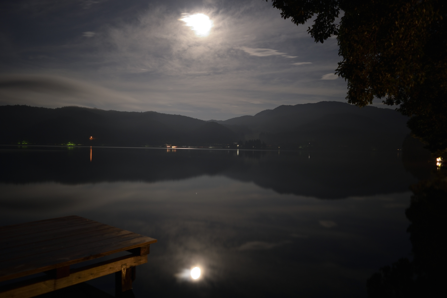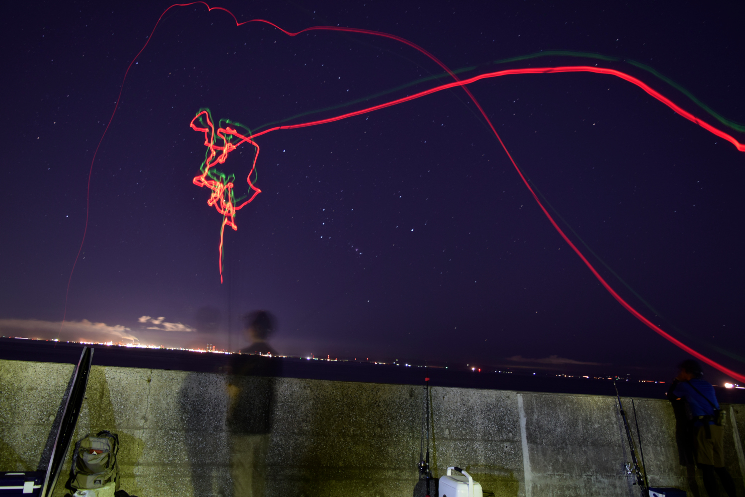 露光時間長めで撮影。赤や緑の点はウキの明かりです。