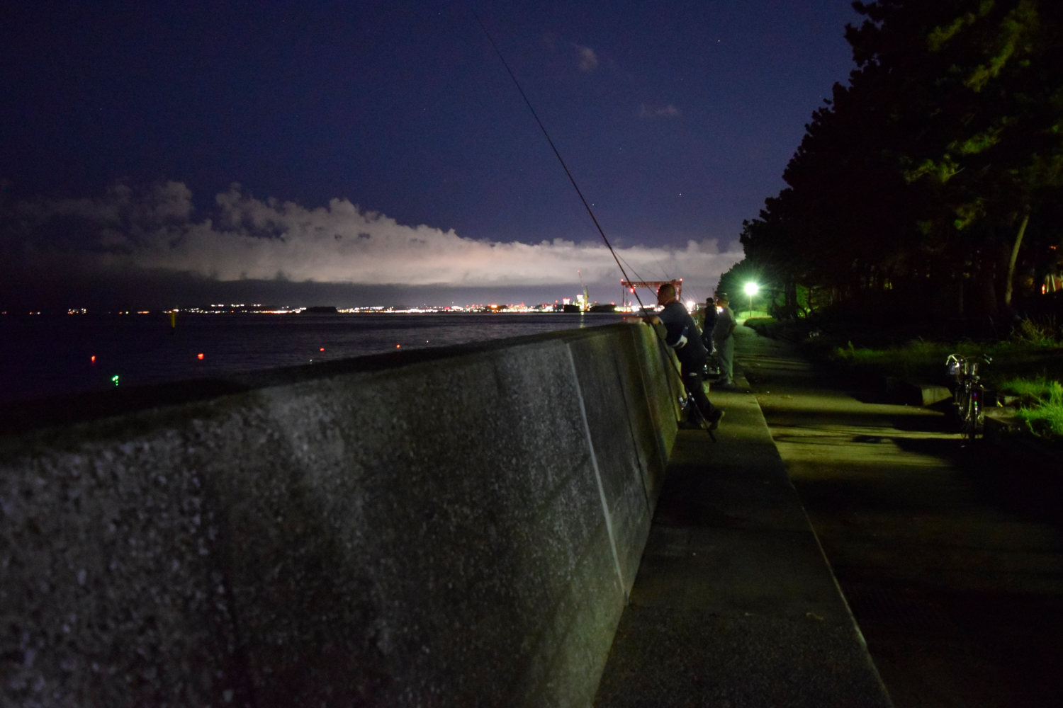 金曜日は残業はほどほどに、同じ課の先輩と同期の3人で夜釣りに行ってきました。