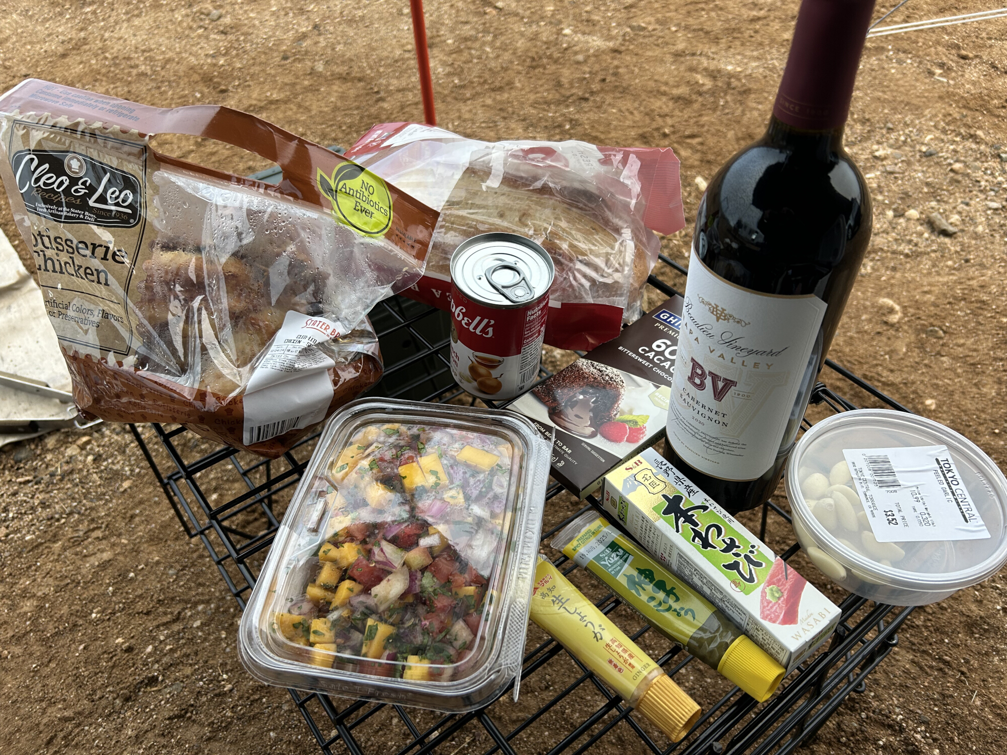 左がホールチキン(丸鶏)、中央上からフランスパン、オニオンスープ缶、チョコ、