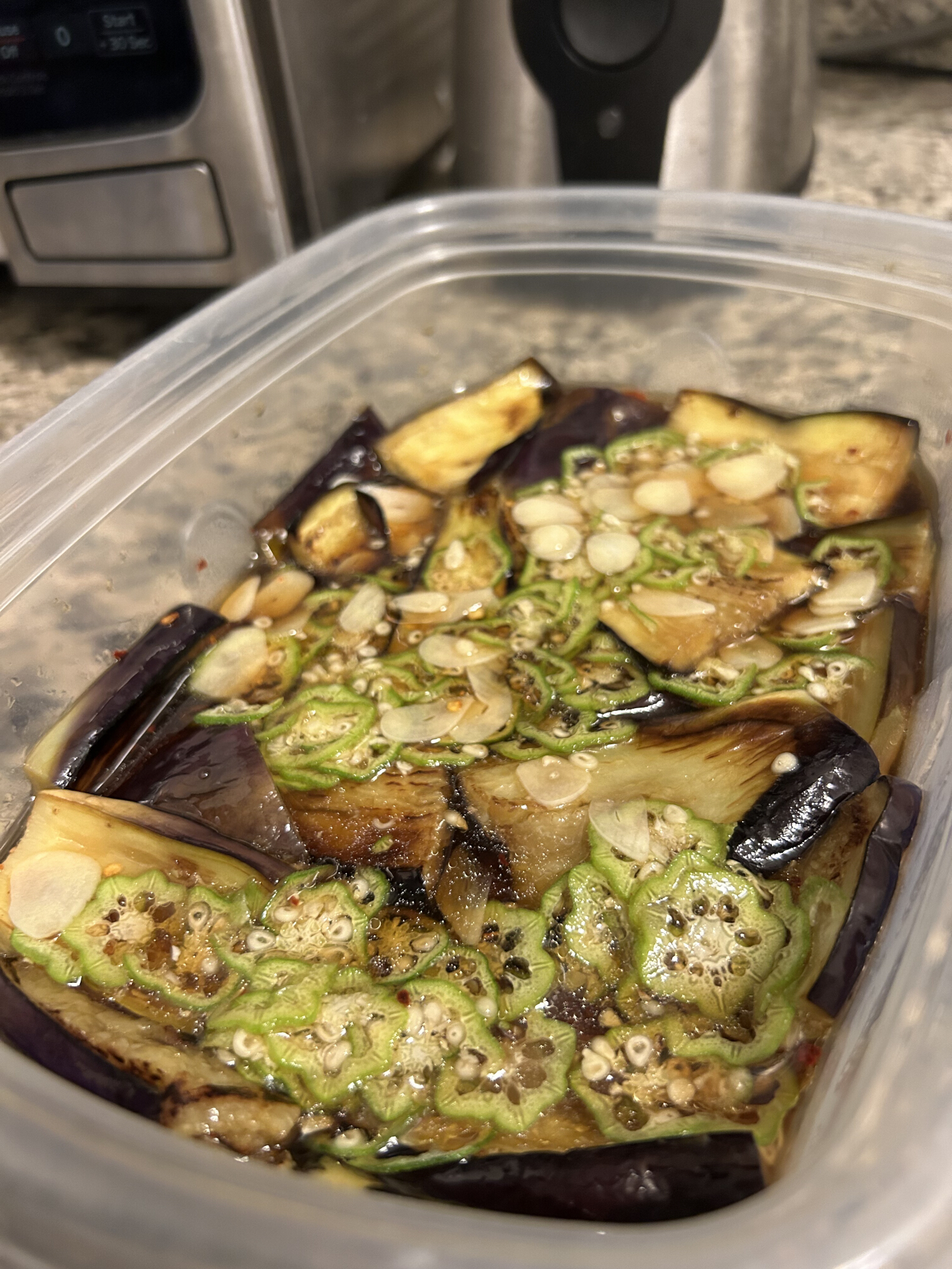 それをめんつゆとオクラとにんにくで漬ける。唐辛子も。
