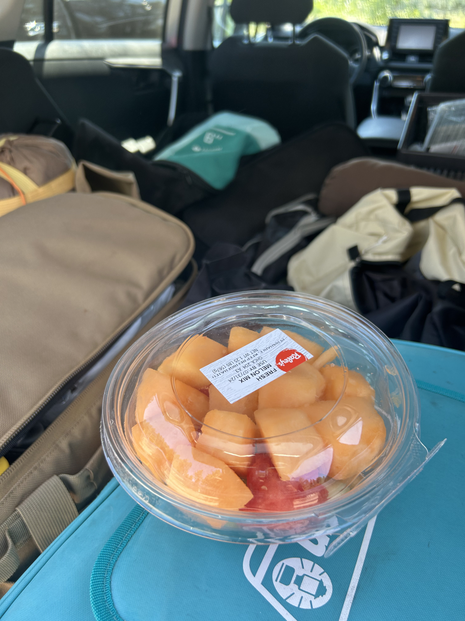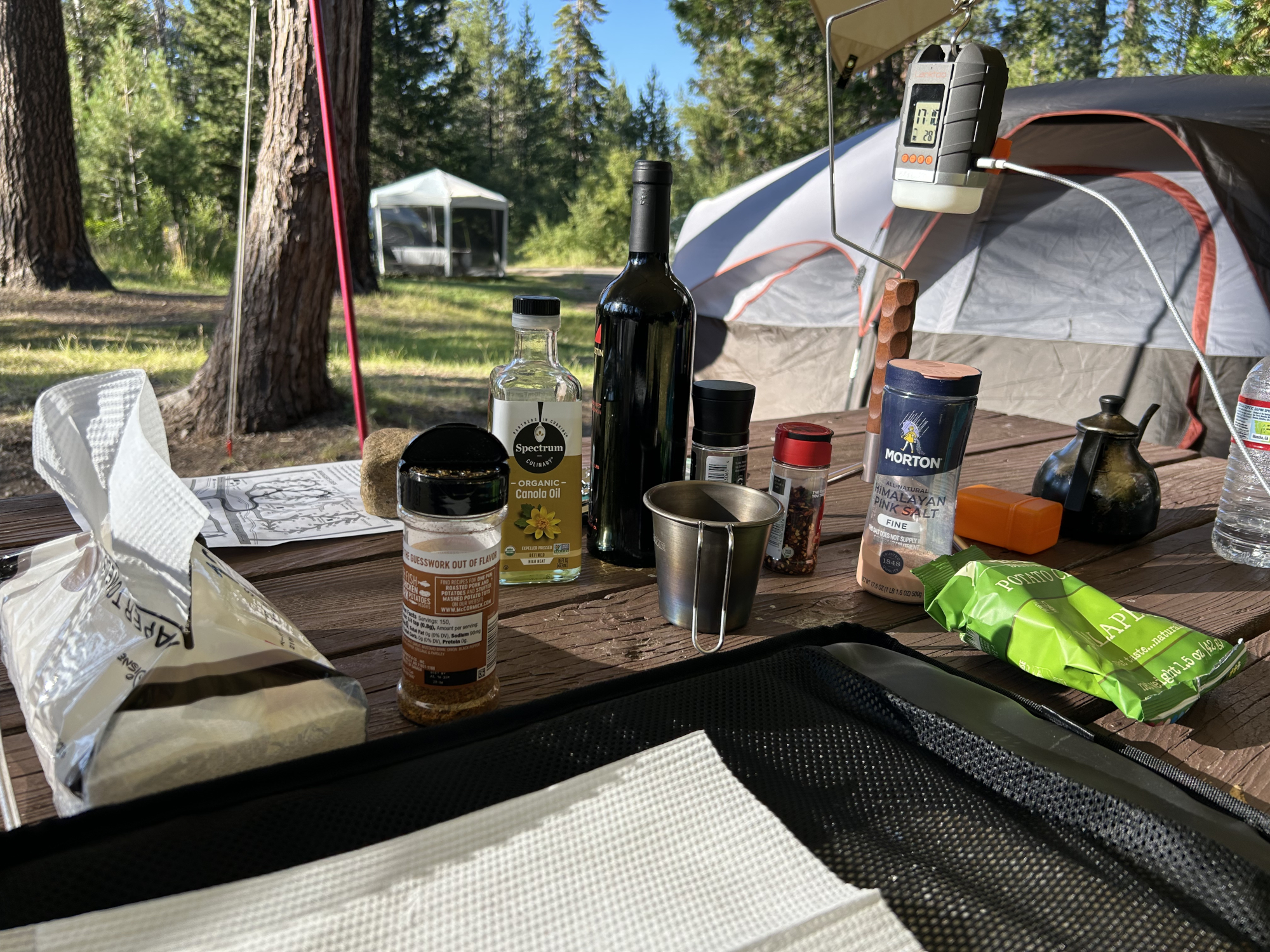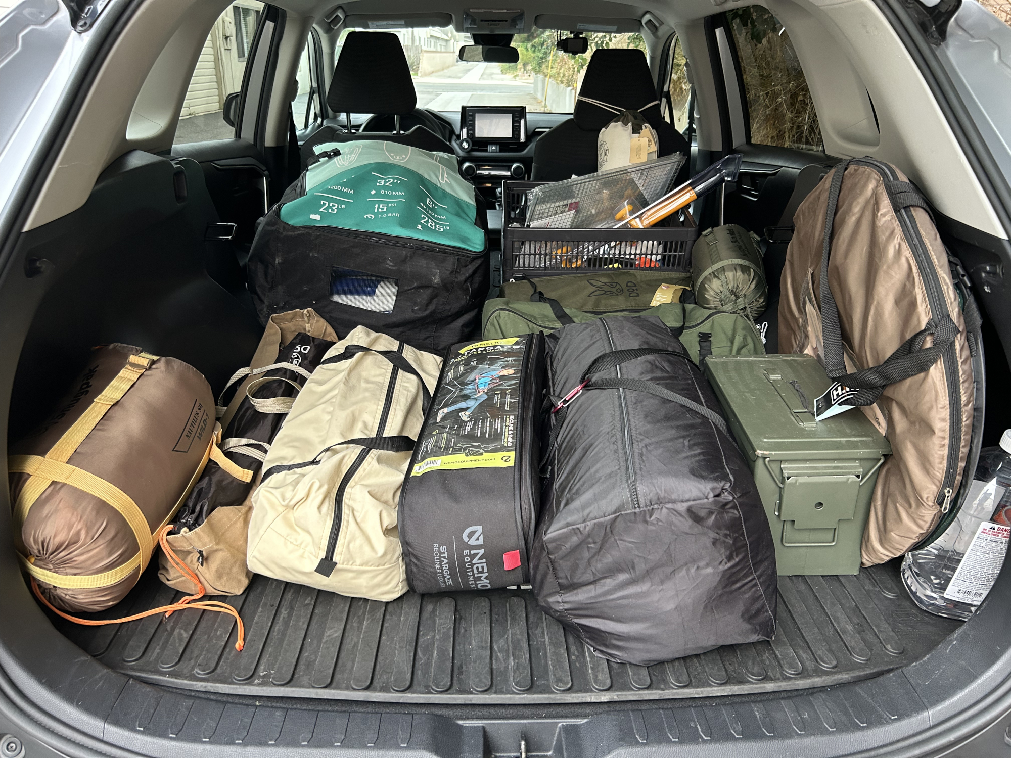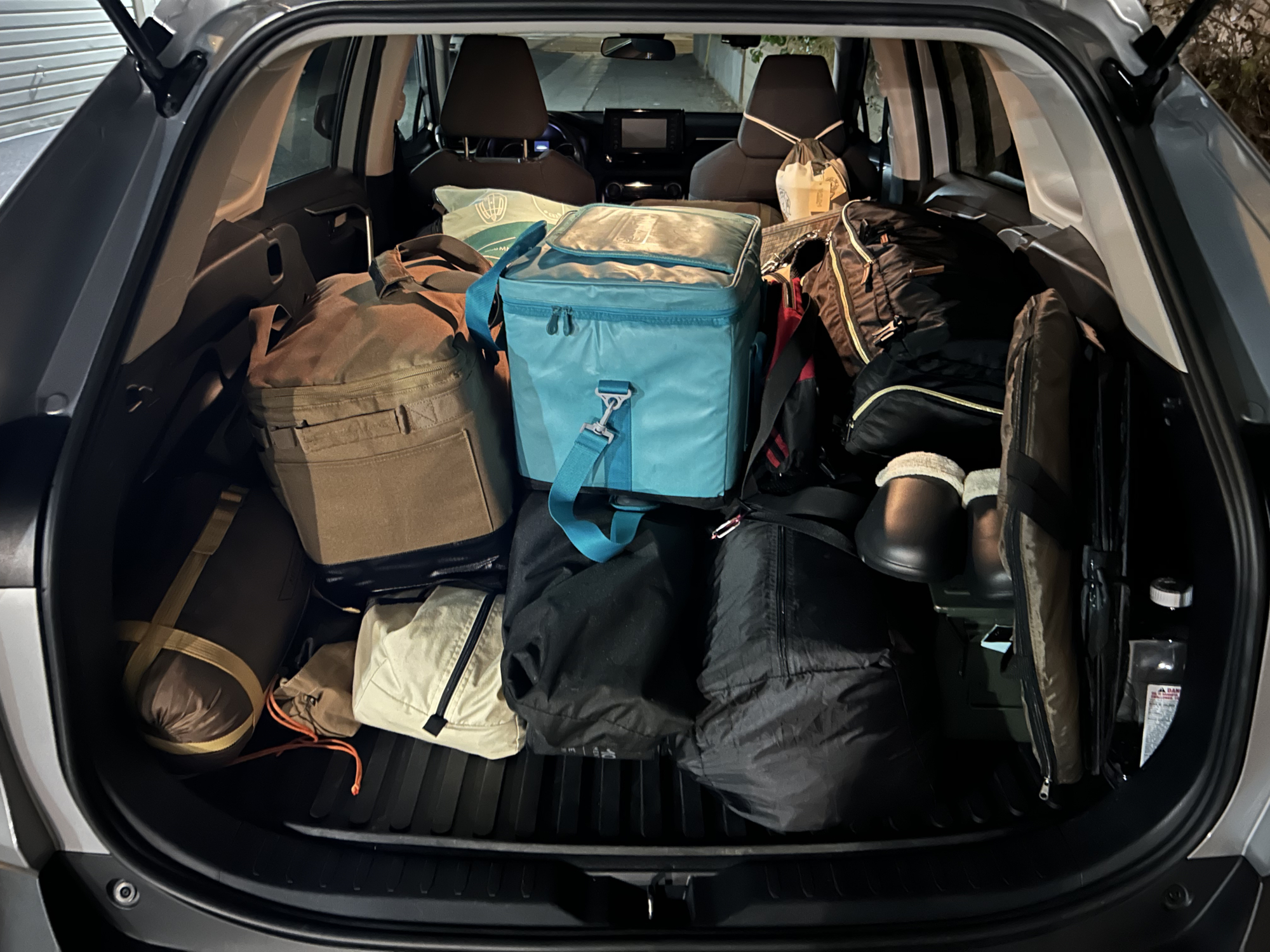 ソフトクーラーボックスに保冷剤やら調味料やらを詰め込み、いざ出発。