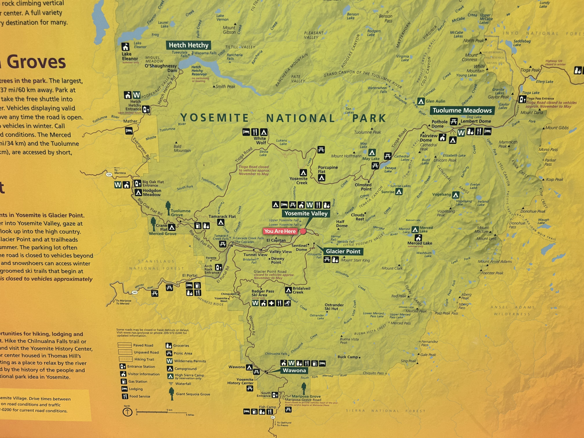下の方から続く道路を走ってきて、Yosemite Valleyにいます。ここがメイン。