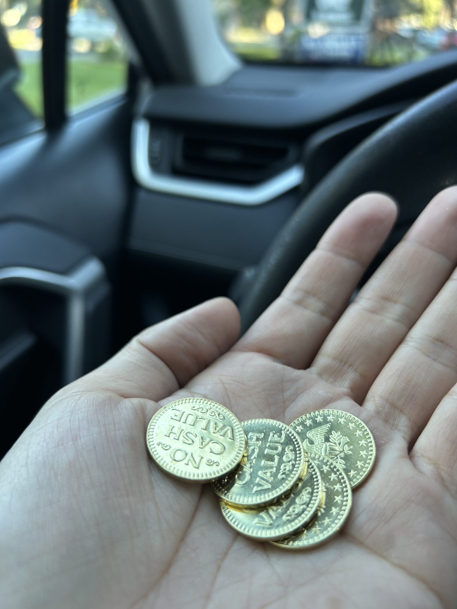 ですが、見てびっくり。専用コインが必要と…10分1ドルらしく、受付で買ってねと…