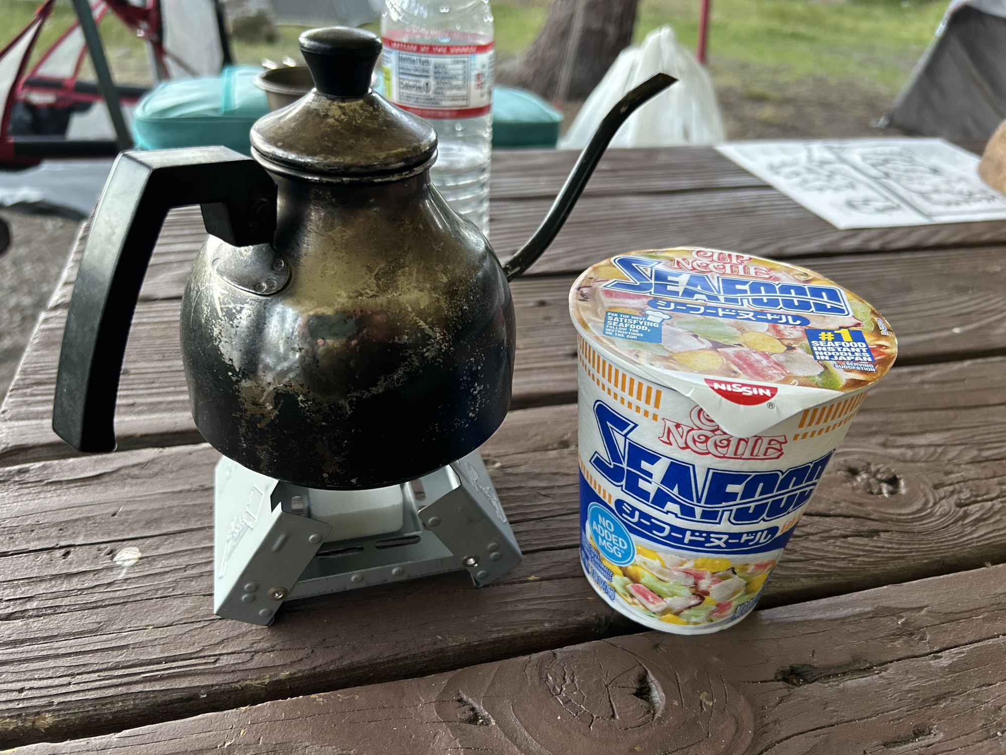 キャンプ場へ来て最初の飯はやっぱりカップヌードル。シーフード味。