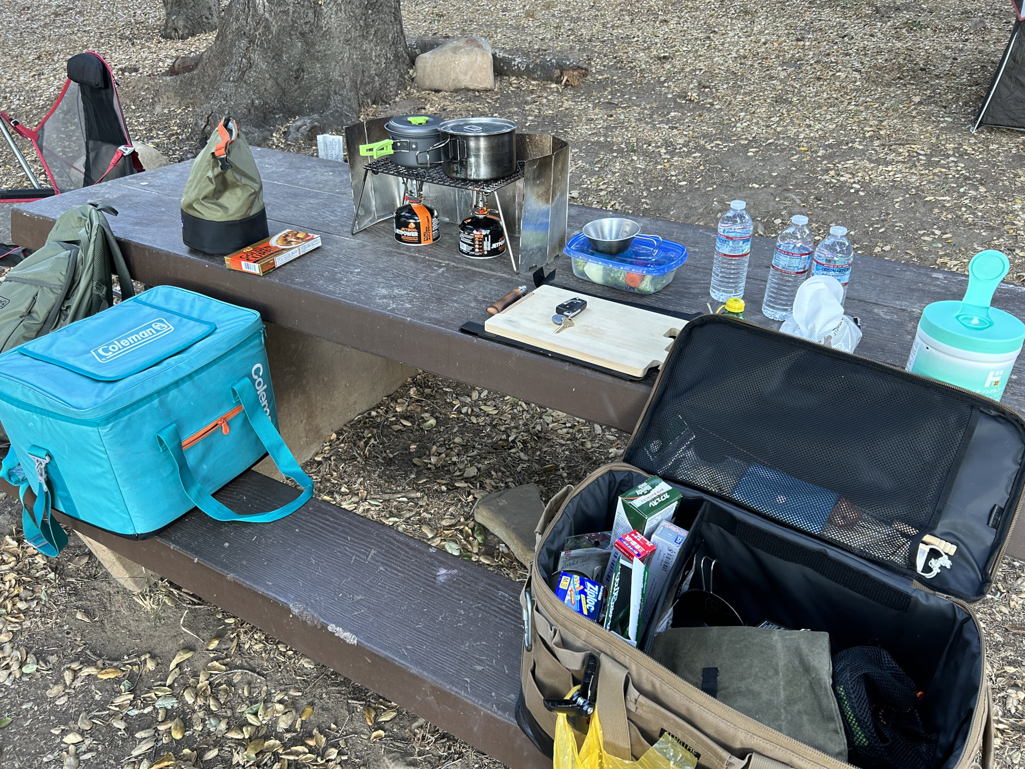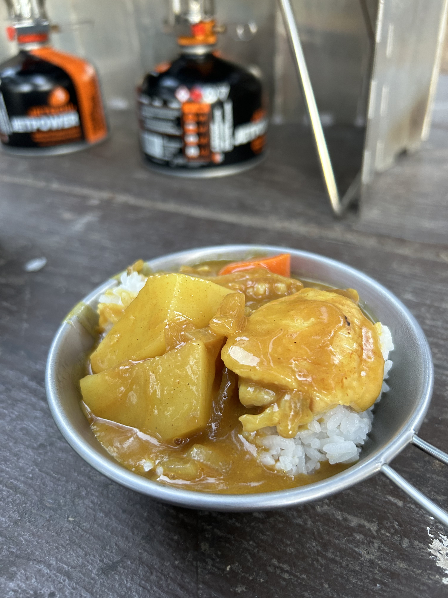 テーブルがあるとやはり楽ですね。OD缶2つで炊飯とカレー。
