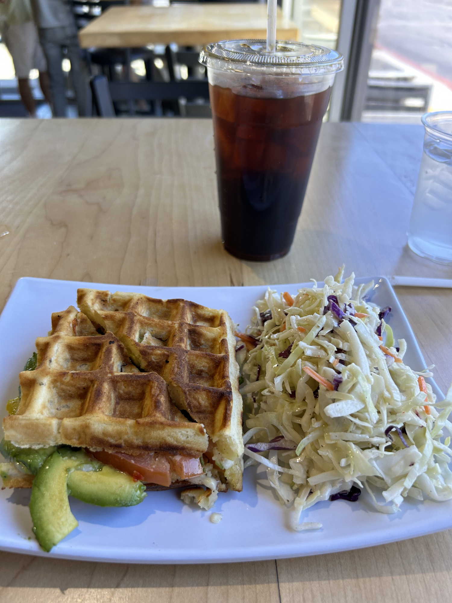 ワッフルのサンドイッチとコーヒーとコールスロー。