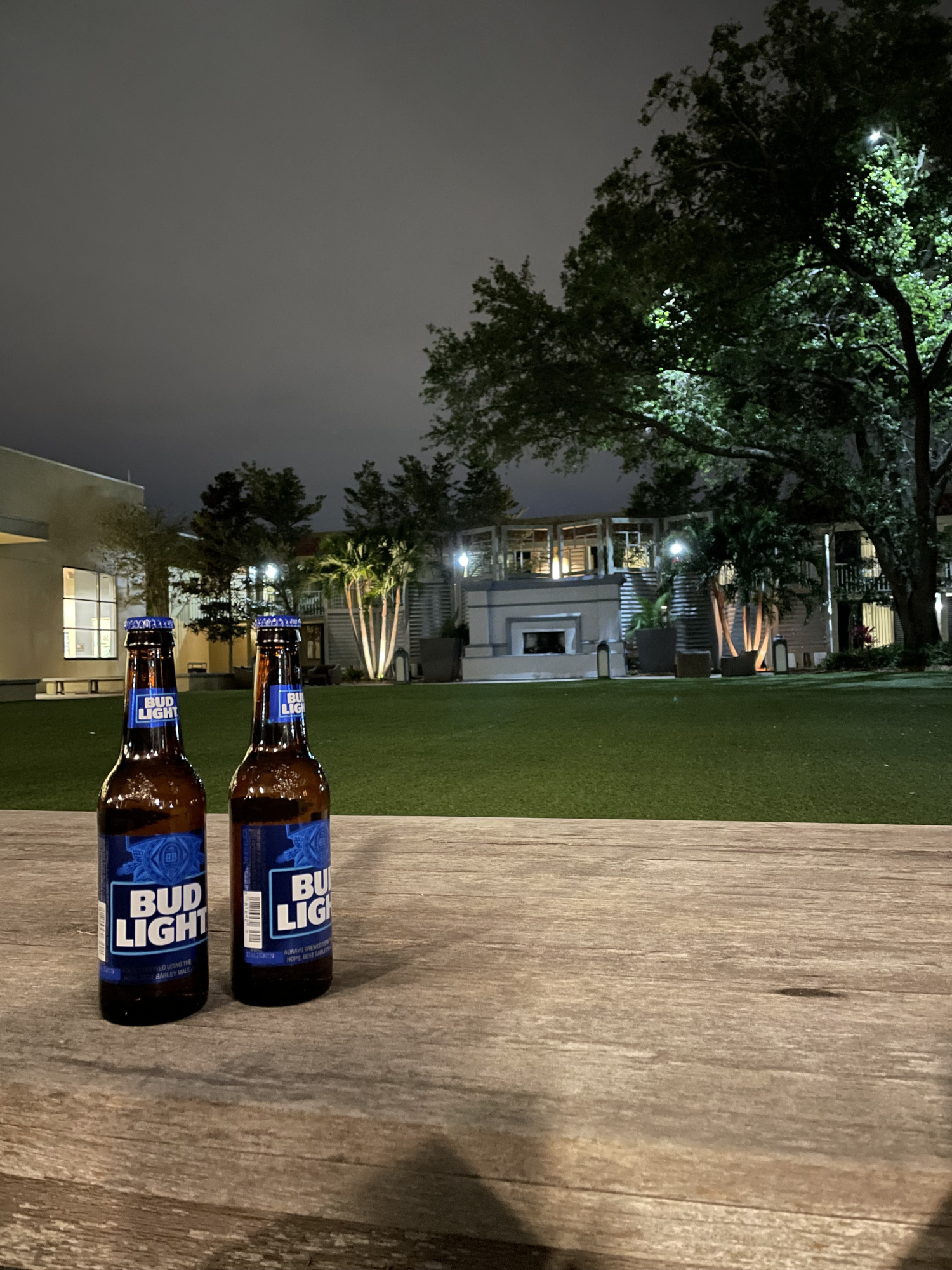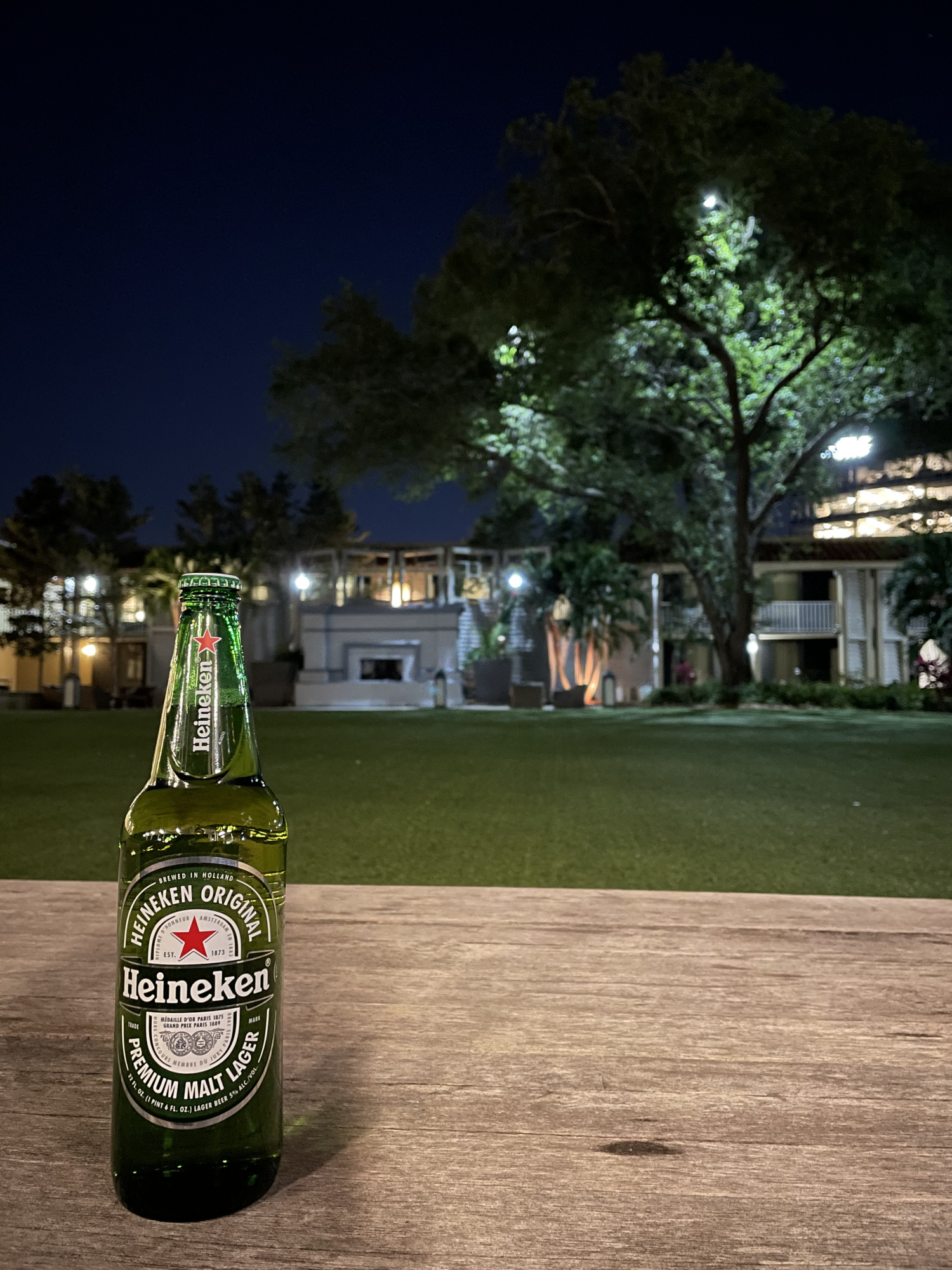で、夕食後は、近くの酒屋にてビールを購入。ホテルの庭にて後輩と談笑…