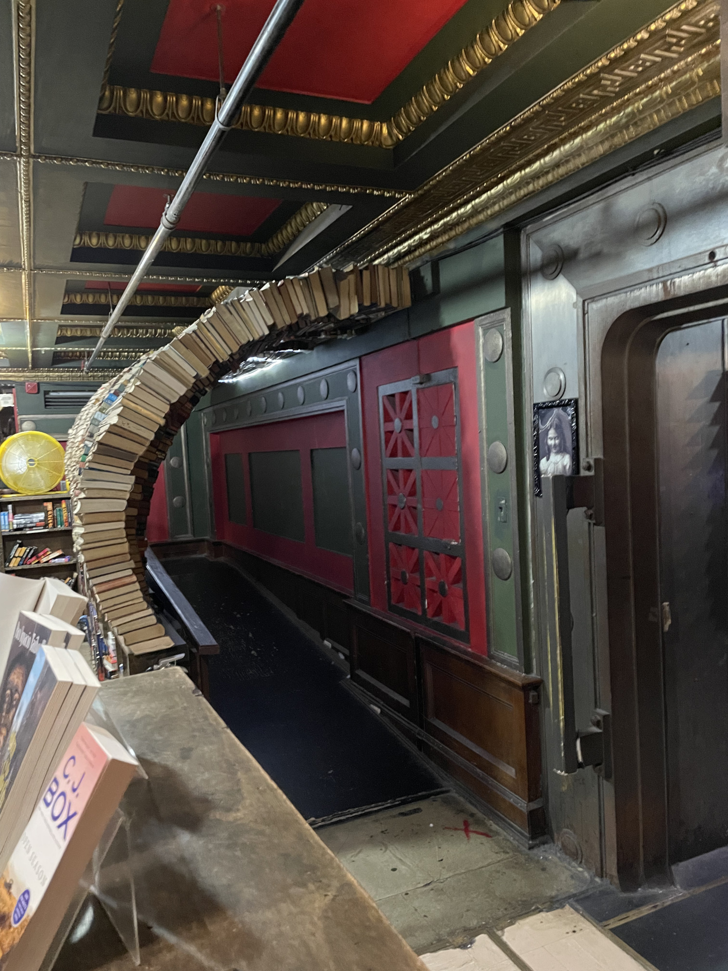 本の通路。丸い穴の空いた本棚もあったり。