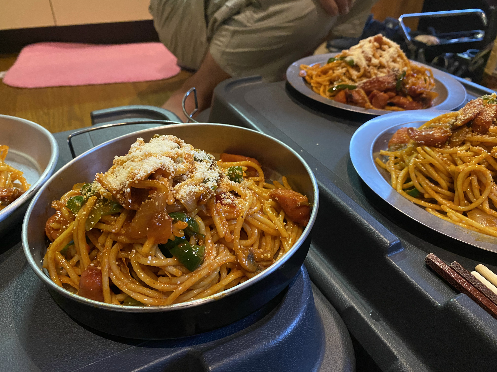 昼飯は、ナポリタン。夕飯には焼き鳥。