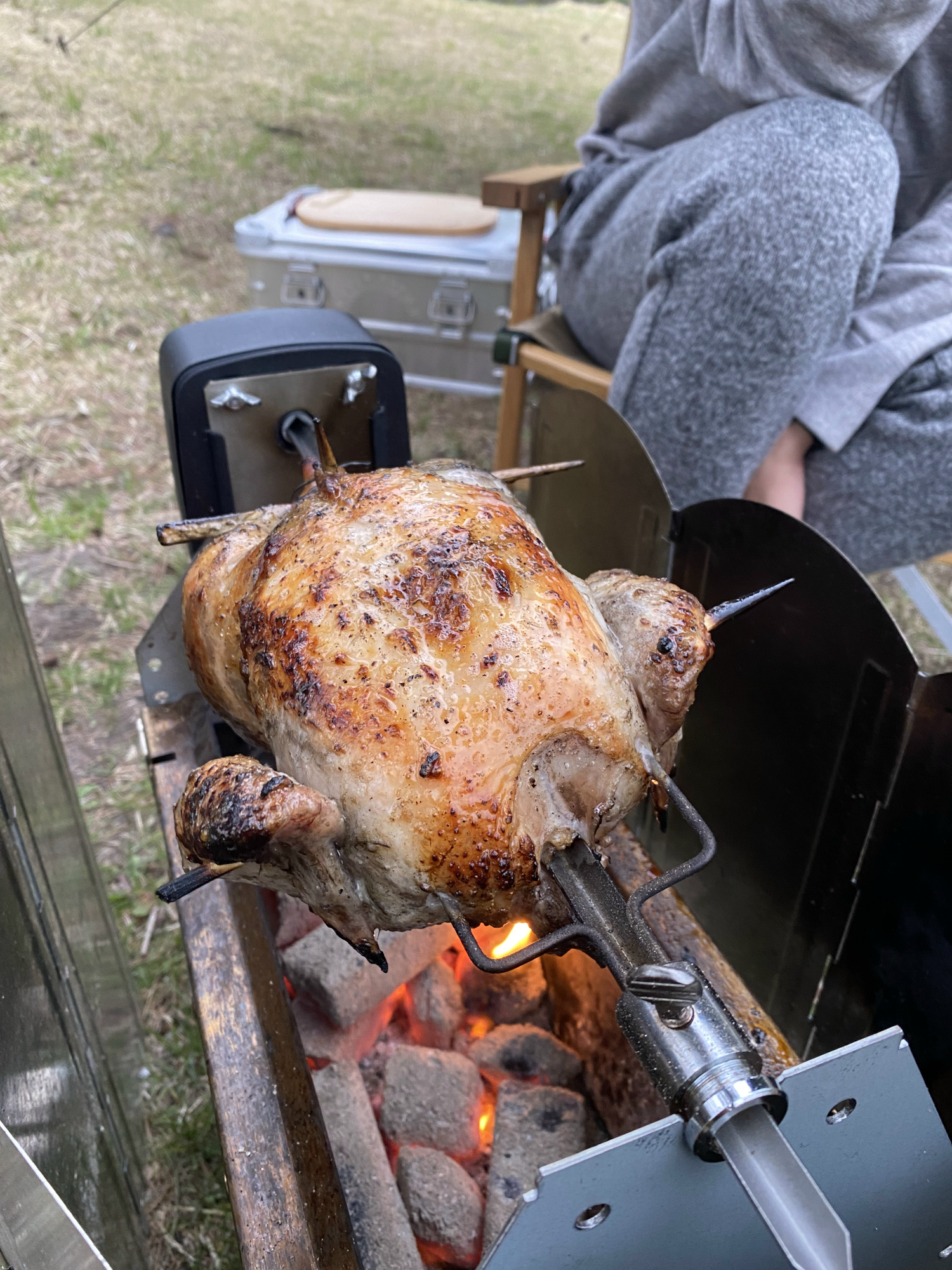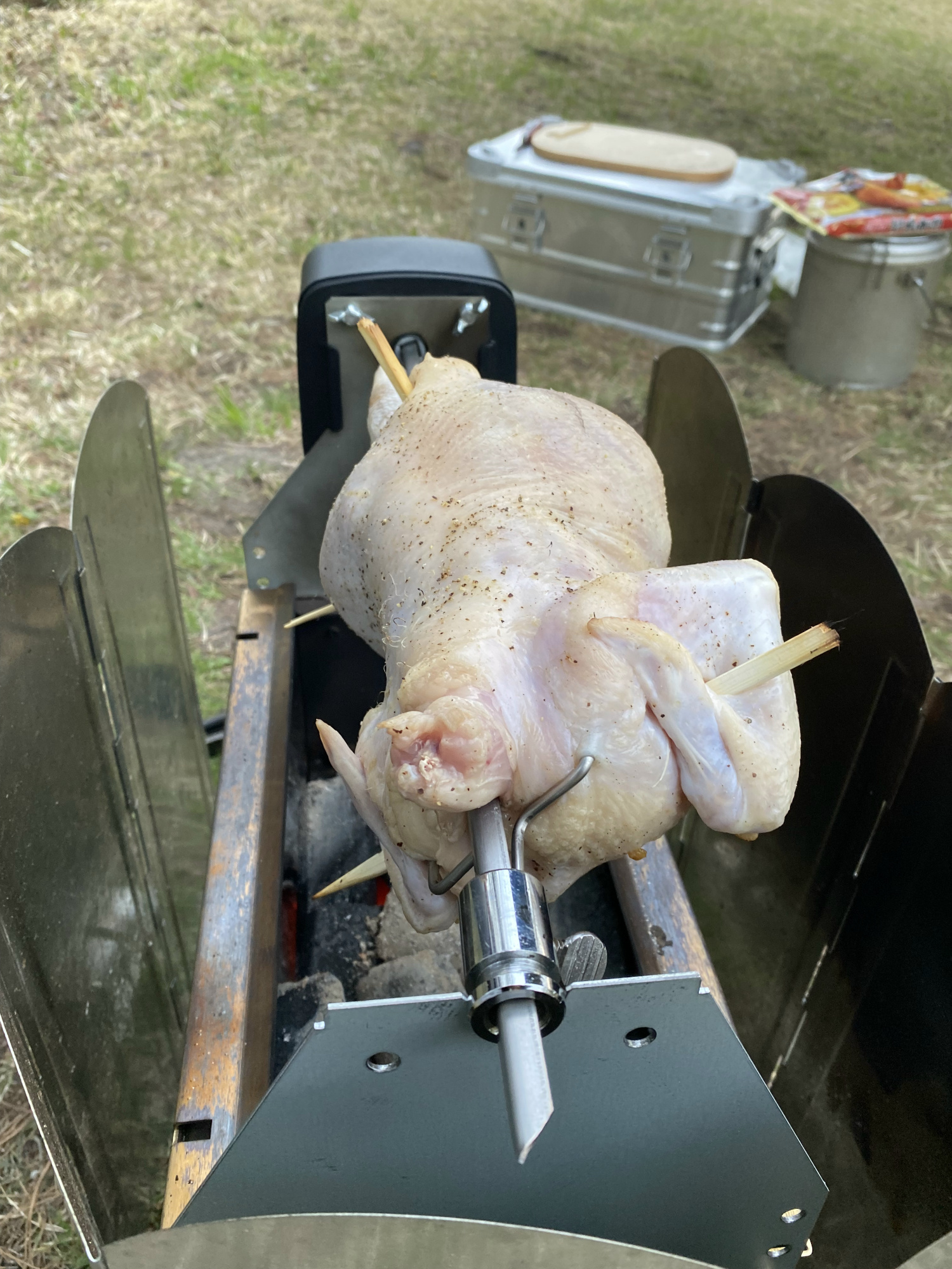 回転させながら焼いていって、30分程度でこんがり。火加減は難しいと判明。