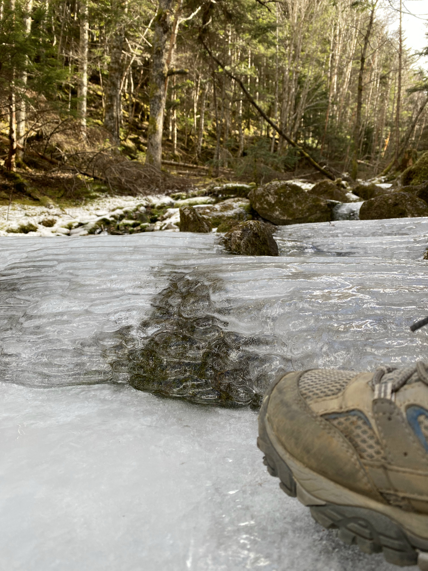 少し進んだところに、同じく凍った小さなナメ滝があったので、靴と並べて1枚。