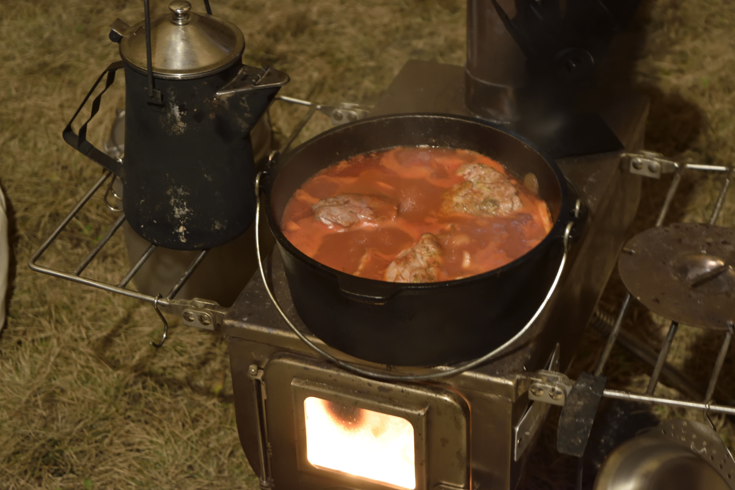で、熱源のストーブの中には細長いダッチオーブン。その中にはサツマイモ^^