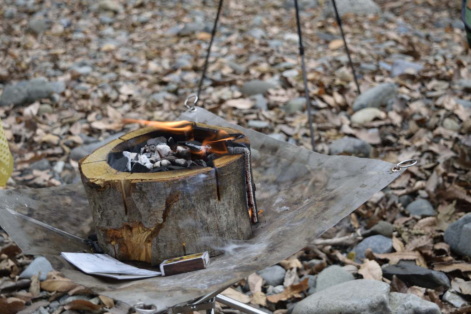 下側も燃えてくると、炭が落ちて、メッシュの焚き火台の下があったかくなります。