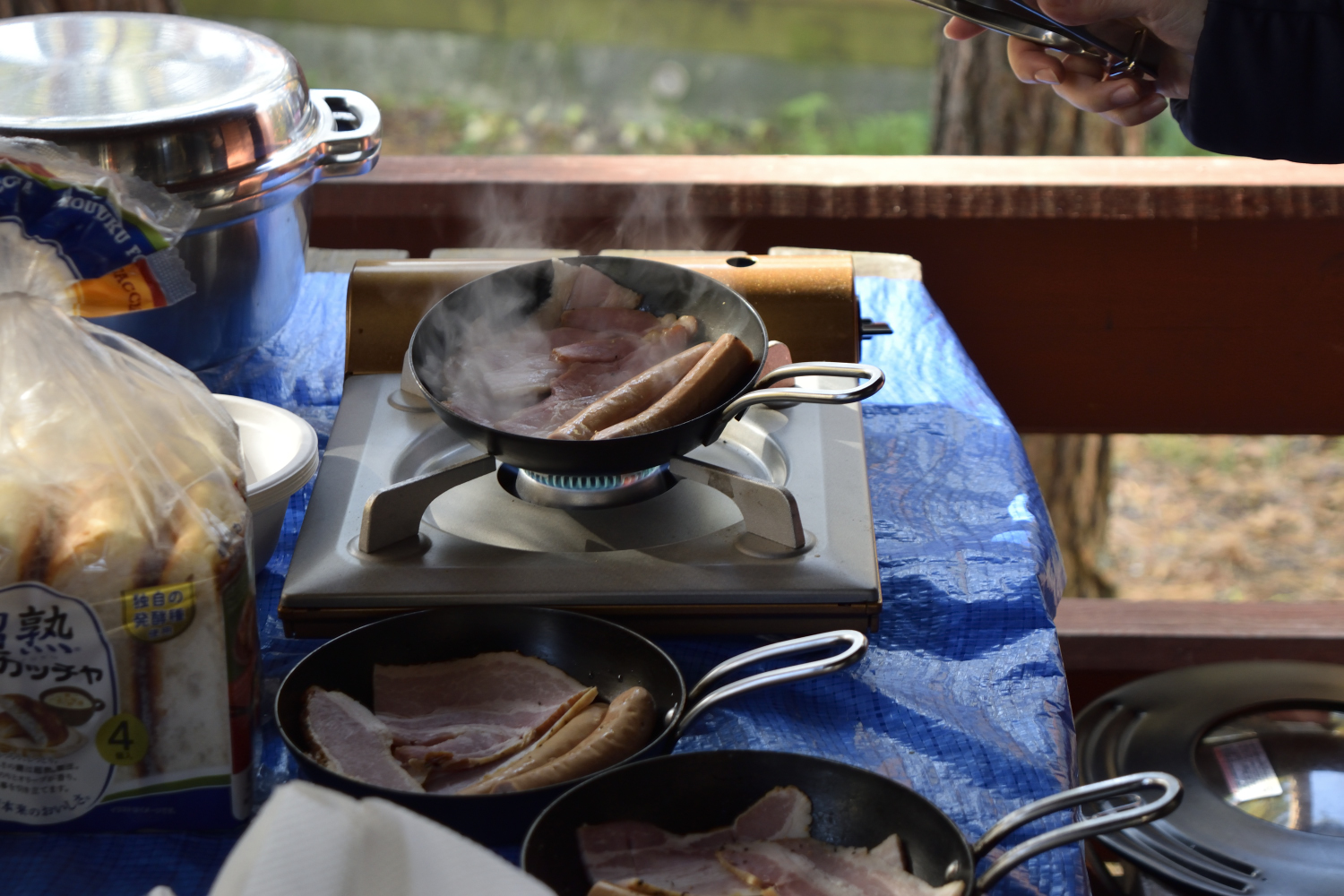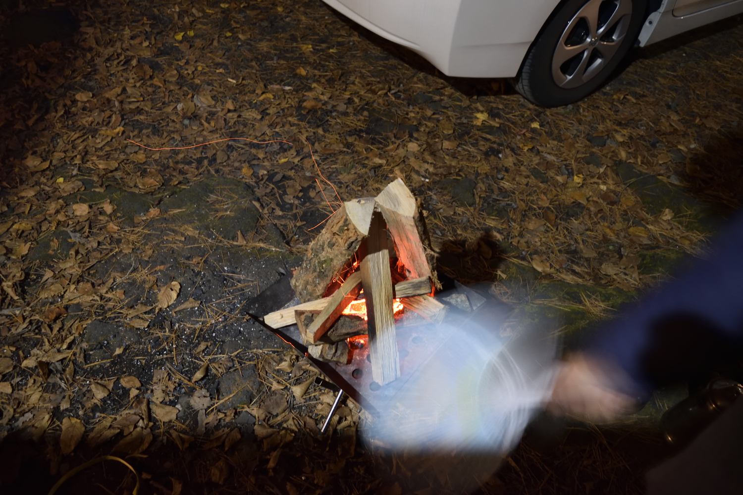 借りた焚き火台では薪に火がなかなかつかず、近くに落ちていた松ぼっくりとか